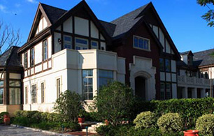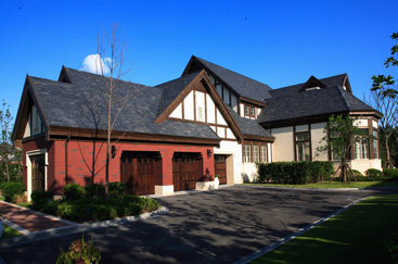 英式建筑的主要特征为双坡陡屋面、深檐口、外露木构架、砖砌底脚等。屋面高低错落,色彩以青灰色为主,外墙材料多采用红砖,配以木饰,细密的窗户分格、精美的雕刻栏杆,体现出英式别墅考究、细腻的特质。