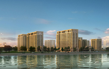 石材系列公寓采用古典主义三段式的建筑立面构图,通过顶部缩进、底层架空来处理。讲求石材幕墙的开窗比,形体简单利落,没有过多的进退变化,立面形成统一而均匀的节奏。取消原绿园弧形元素,改为直线,将石材横向线条做薄,使建筑整体更为通透、轻盈。采用大面积落地玻璃窗设计,将景观阳台和生活阳台整体贯通,阳台采用玻璃栏板,使建筑更为舒展,整体立面虚实对比更为明显,同时也提高了住宅的舒适度。沿街商业裙房采用法国古典主义建筑风格。